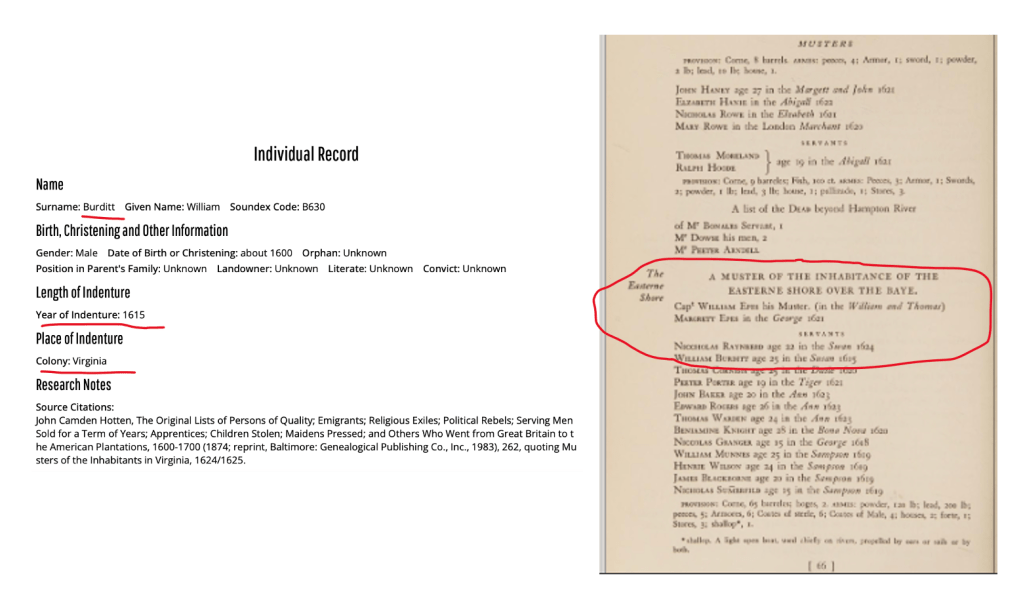 I followed one of the resources that NSCDIS suggests and headed to the Immigrant Services Database and I found William Burditt there as “Ancestor #630”. I also found William Burditt listed as a servant of William Epes in John Camden Hotten’s “The original lists of persons of quality; emigrants; religious exiles; political rebels; serving men sold for a term of years; apprentices; children stolen; maidens pressed; and others who went from Great Britain to the American plantations 1600-1700” book which added extra proof.
